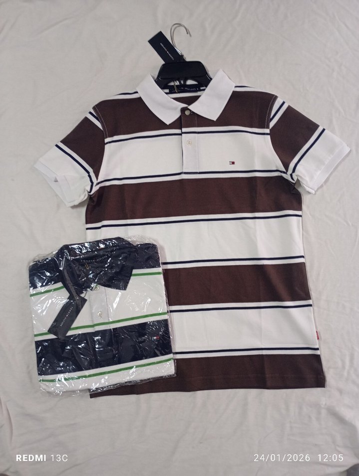 Kahverengi ve beyaz çizgili, kısa kollu, yakalı erkek polo tişört. pamuk kumaştan, regular fit ve günlük kullanıma uygun. Kemer detaylıdır.