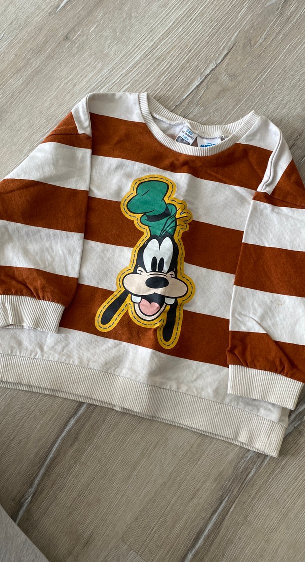 Örgü pamuk kumaştan, uzun kollu, yuvarlak yaka, bol kesim kahverengi-beyaz çizgili ve baskılı erkek sweatshirtü. Rahat ve trend görünüm sağlar.