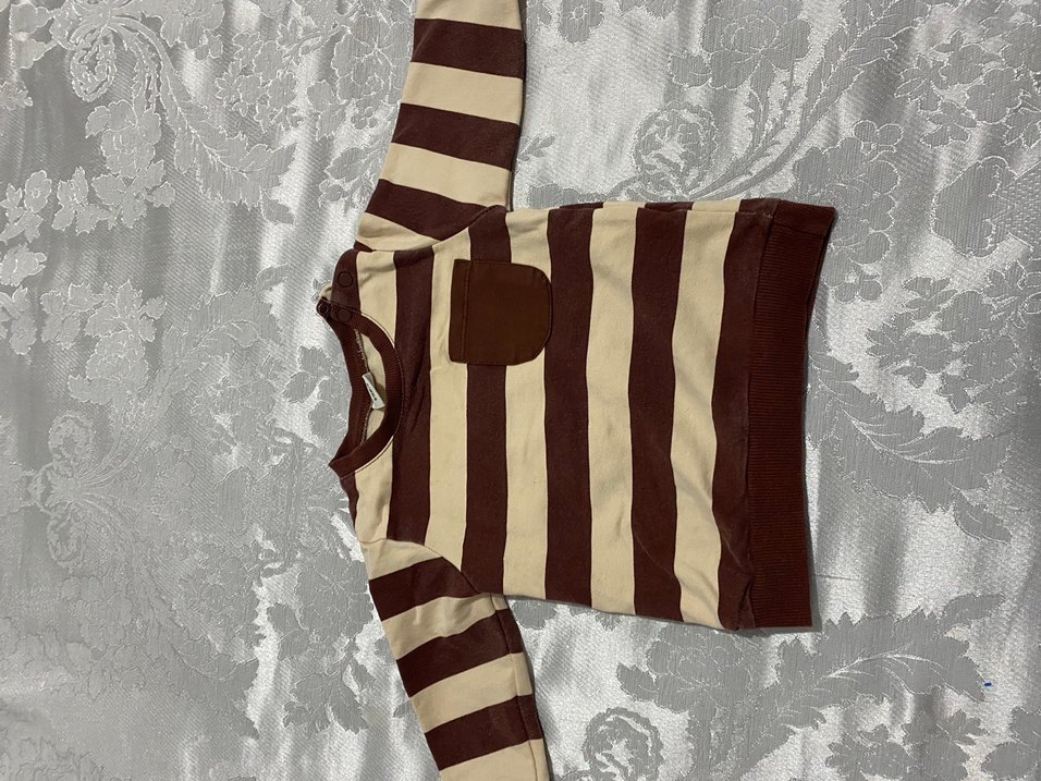 Uzun kollu, bisiklet yakalı, kahverengi ve krem çizgili, yumuşak örme kumaştan yapılmış erkek sweatshirtü. Günlük rahat kullanıma uygun.