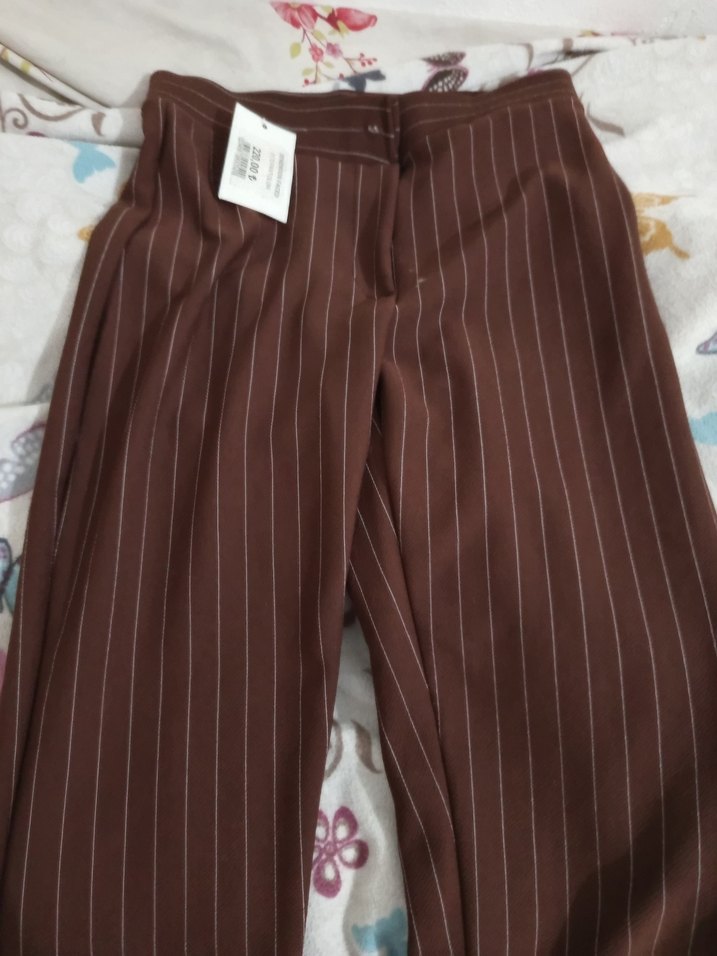 Kahverengi çizgili, regular kesim ve pileli kadın kumaş pantolon, ofis ve sokak stiline uygun, sentetik kumaştan üretilmiştir.