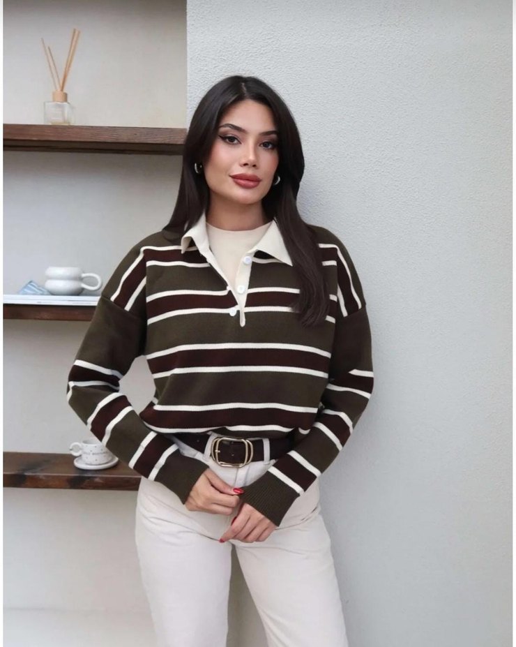 Kahverengi pamuklu sweatshirt, uzun kollu, yakalı ve çizgili desene sahip. Günlük kullanıma uygun, midi boy ve rahat kesim sunar.
