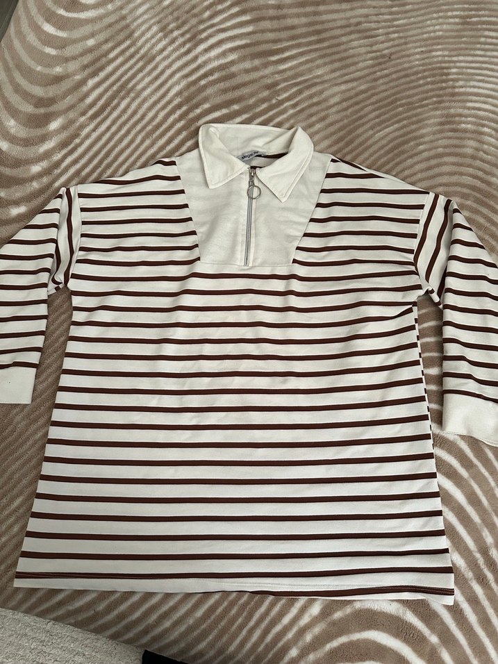 Uzun kollu, yakalı ve fermuarlı kadın sweatshirt. Yumuşak pamuktan, kahverengi çizgilerle beyaz zemin üzerinde, rahat kesim ve günlük kullanım için uygundur.