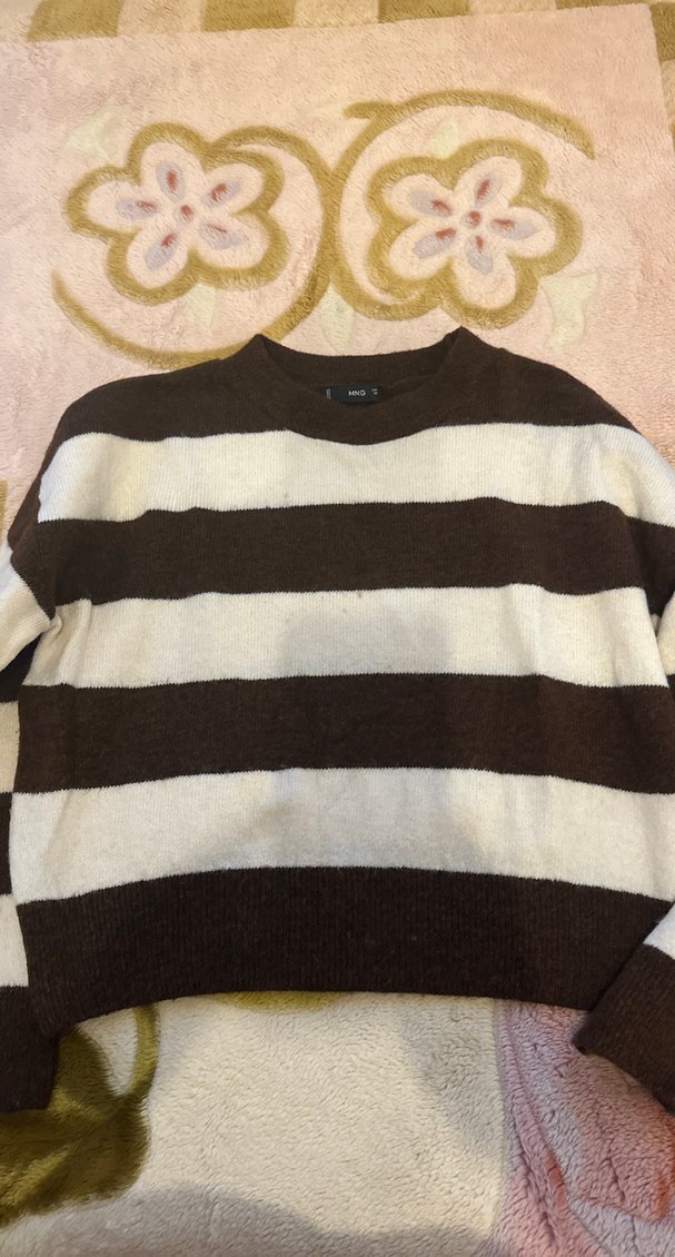 Kahverengi, uzun kollu, yuvarlak yakalı, çizgili ve bol kesim yün triko kazak. Rahat ve sıcak tutar.