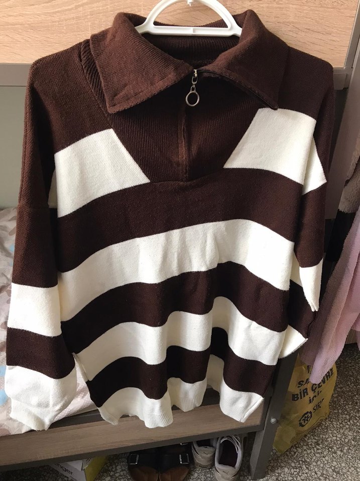 Kadınlar için kahverengi ve beyaz çizgili, fermuarlı yakalı, uzun kollu, bol kesim triko kazak. Rahat ve şık sokak stili için uygundur.