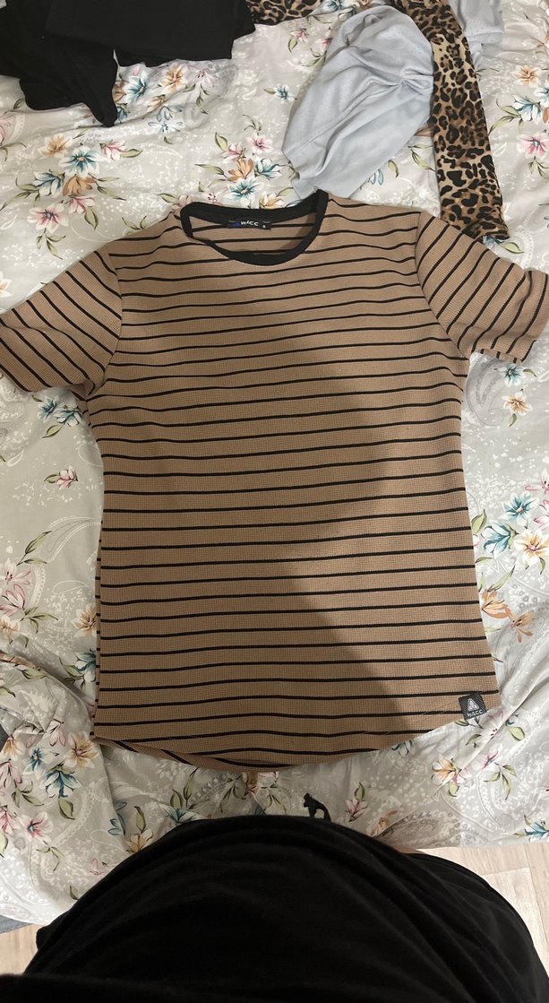 Kısa kollu, yuvarlak yakalı ve kahverengi üzerine ince siyah çizgili, şık ve rahat kesime sahip kadın tişörtü. Günlük kullanıma uygun, sentetik yumuşak kumaştan üretilmiştir.