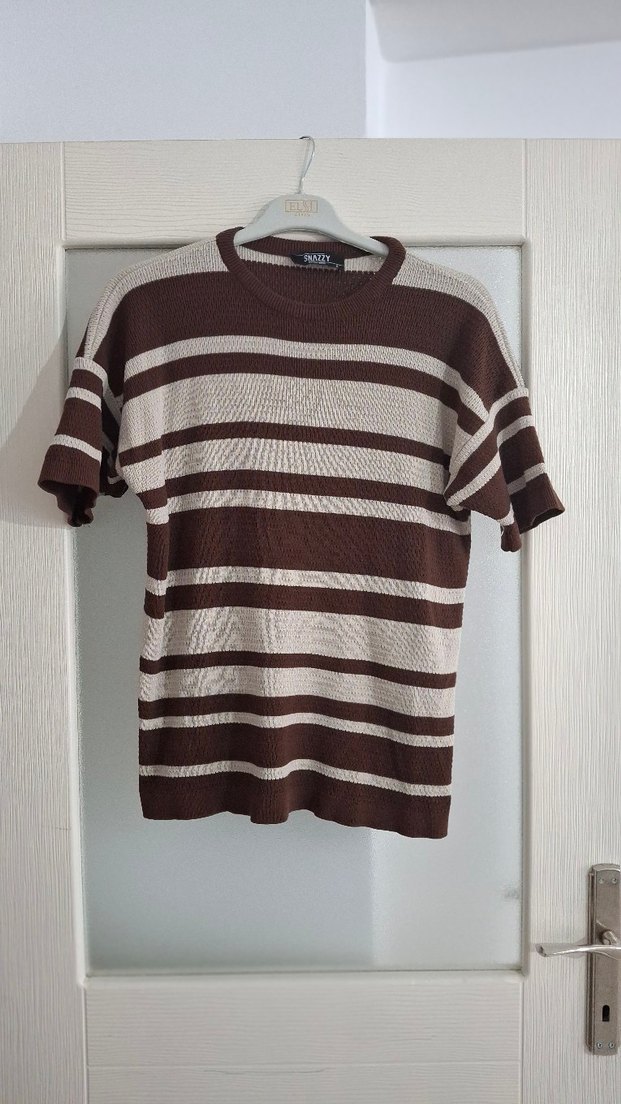 Kahverengi ve gri çizgili, kısa kollu ve yuvarlak yakalı örgü kazak. Rahat kesimi ve normal boyu ile günlük sokak stiline uygundur. BEDEN: S