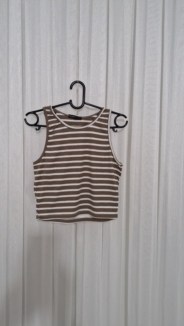 Kahverengi ve gri çizgili, kısa ve fitted kesim triko atlet. Yuvarlak yaka ve kolsuz, rahat sokak tarzı için uygun.