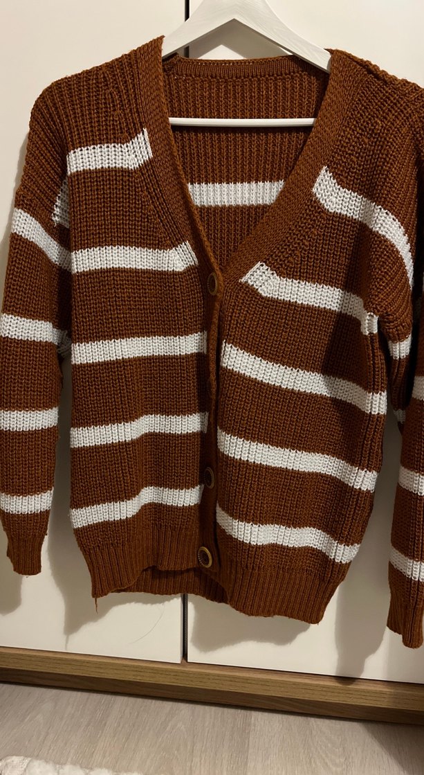 Kahverengi çizgili triko hırka, uzun kollu ve bol kesimdir. V yaka ve midi boyda, rahat sokak tarzı için uygundur.
