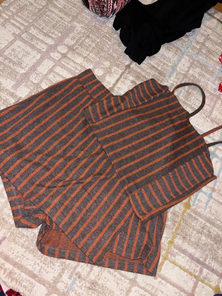 Koyu kahverengi zemin üzerine turuncu çizgilerle klasik çizgili desenli mutfak önlüğü. Ayarlanabilir boyun askısı ve bağlama ipleri bulunur.