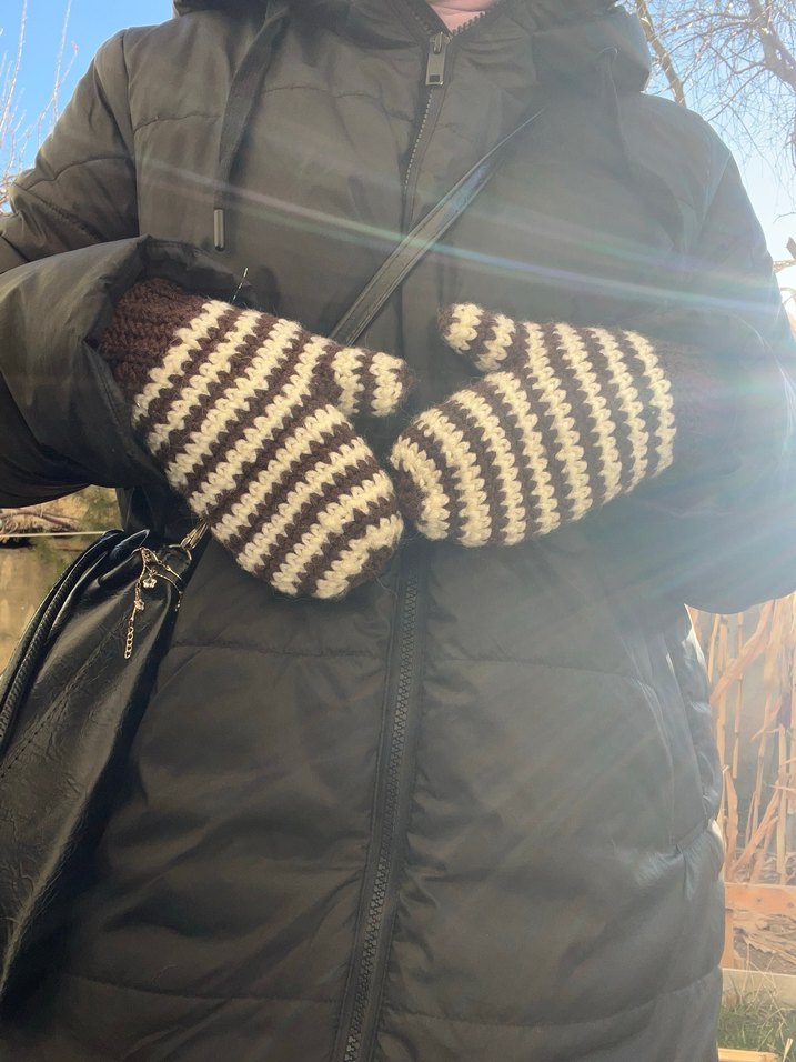 Kahverengi ve krem çizgili örgü eldivenler, bohem tarzı sevenler için sıcak ve retro bir görünüm sunar. Kalın örgü kumaşı elleri soğuktan korur. ( El ölcüsü olarak biraz küçük o yüzden alırken ona dikkat edebilirsiniz )