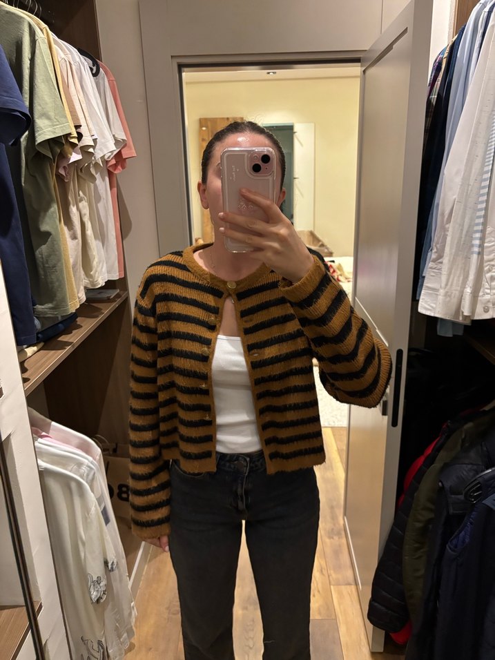 Kahverengi çizgili, uzun kollu ve yuvarlak yakalı, rahat kesim örgü kazak. Normal boyu ve gündelik kullanıma uygun tarzda.