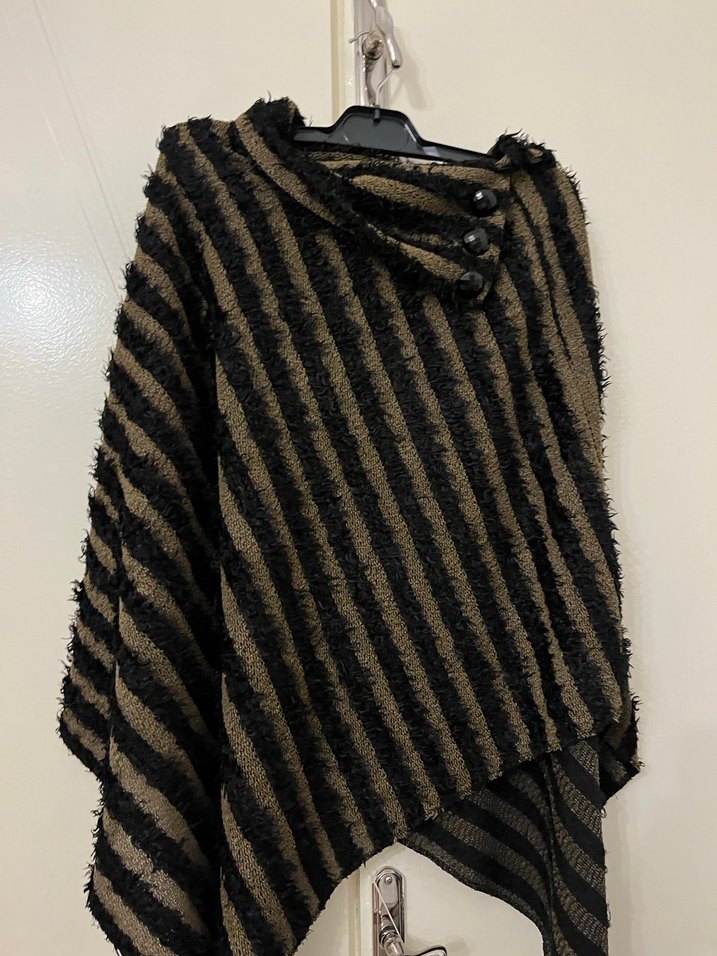 Kadınlar için uzun kollu, bol kesim ve yüksek yakalı kahverengi çizgili örgü panço. Rahat ve bohem tarzıyla günlük kullanım için uygundur.