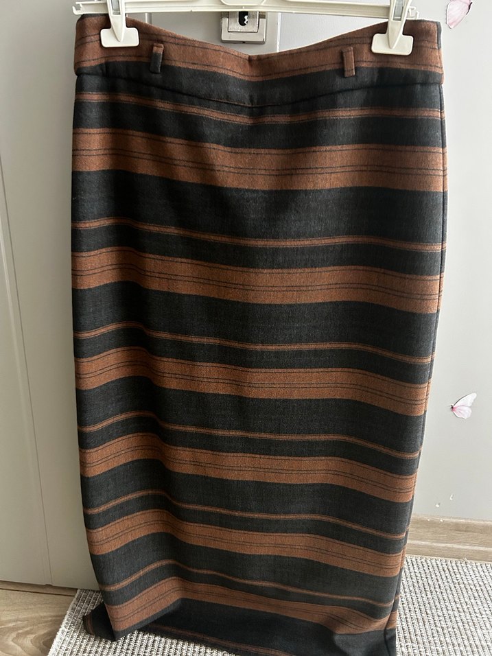 Kahverengi ve koyu çizgili sentetik kumaştan, pilili ve regular fit uzun etek.