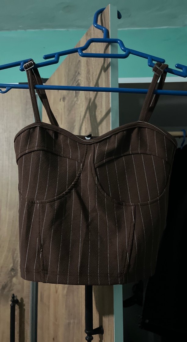 Kahverengi, çizgili, ince askılı ve kemerli detaylı, normal midi boyda, vücuda oturan bustiyer. Rahat sokak stili için uygundur.
