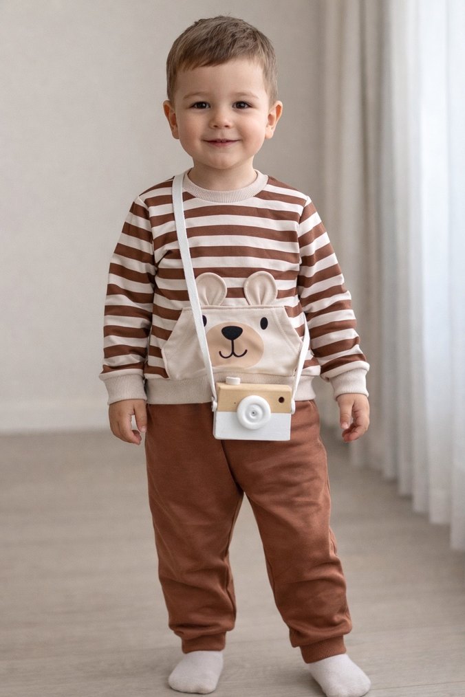 Uzun kollu, yuvarlak yakalı üstü çizgili ve ayıcık figürlü örme cepli, kahverengi bebek takımı. Rahat, açık kahverengi pantolonla tamamlanır. Bedenleri mevcuttur 2/3/4/5