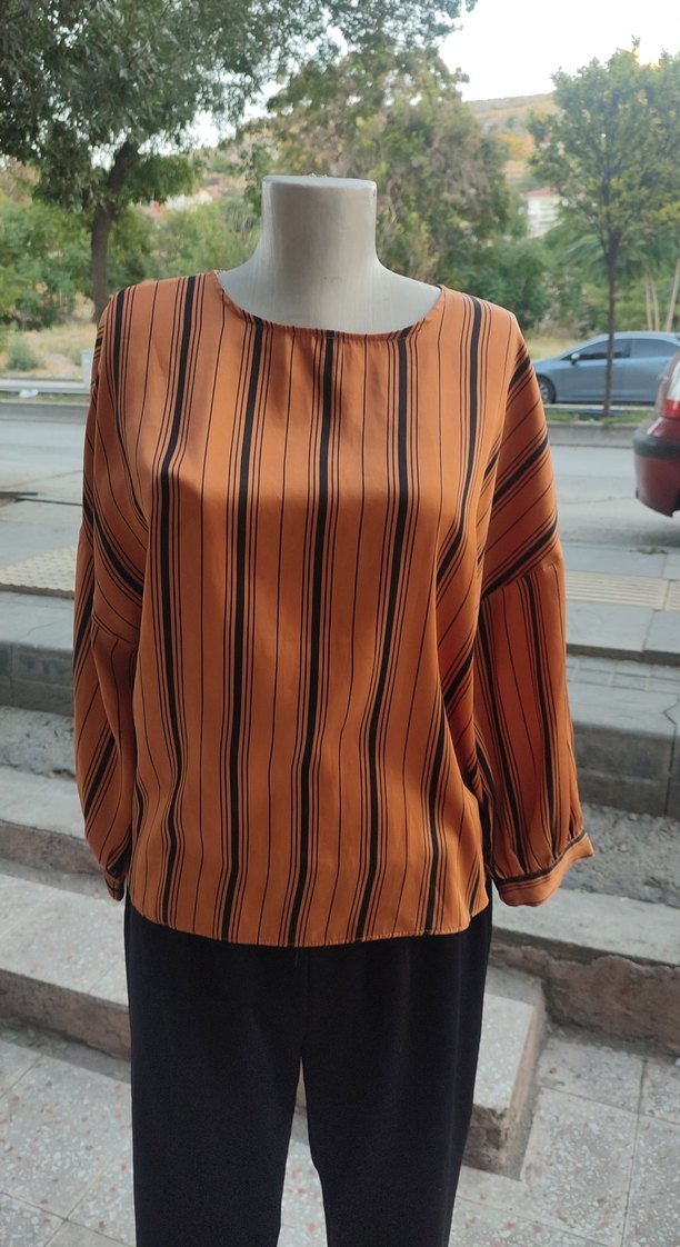 Kahverengi çizgili, uzun kollu, salaş kesim bluz. Tekne yaka ve pile detayları bulunan, parlak sentetik kumaştan üretilmiştir.