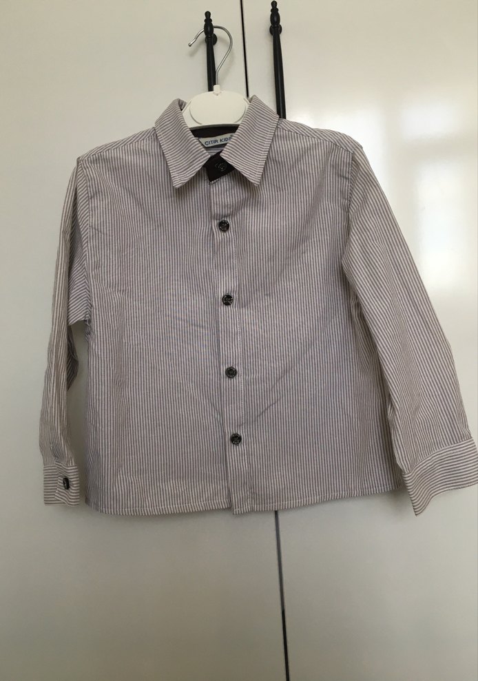 Kahverengi çizgili, uzun kollu, düğmeli erkek gömlek. Regular fit kesim, pamuklu yumuşak kumaş, klasik yaka ve çizgili desenli.