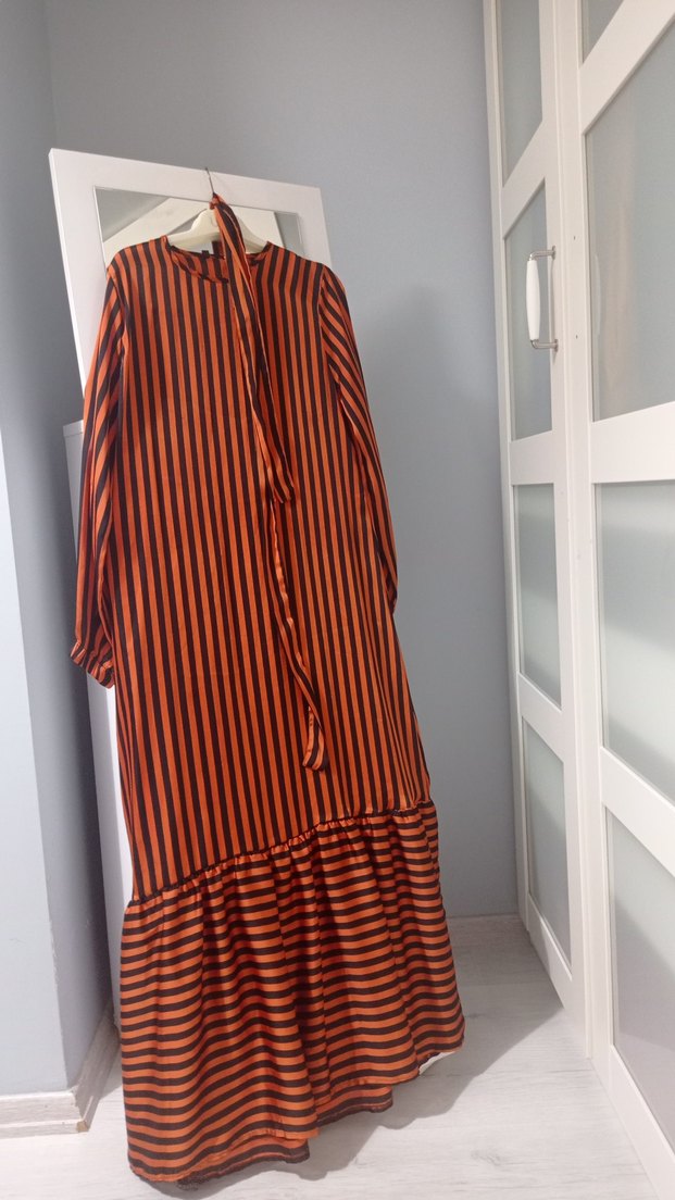 Kahverengi çizgili, uzun ve pliseli elbise. Bol kesim, uzun kollu ve tekne yaka, sentetik kumaştan üretilmiştir. Bohem ve retro tarzıyla günlük kullanıma uygundur.