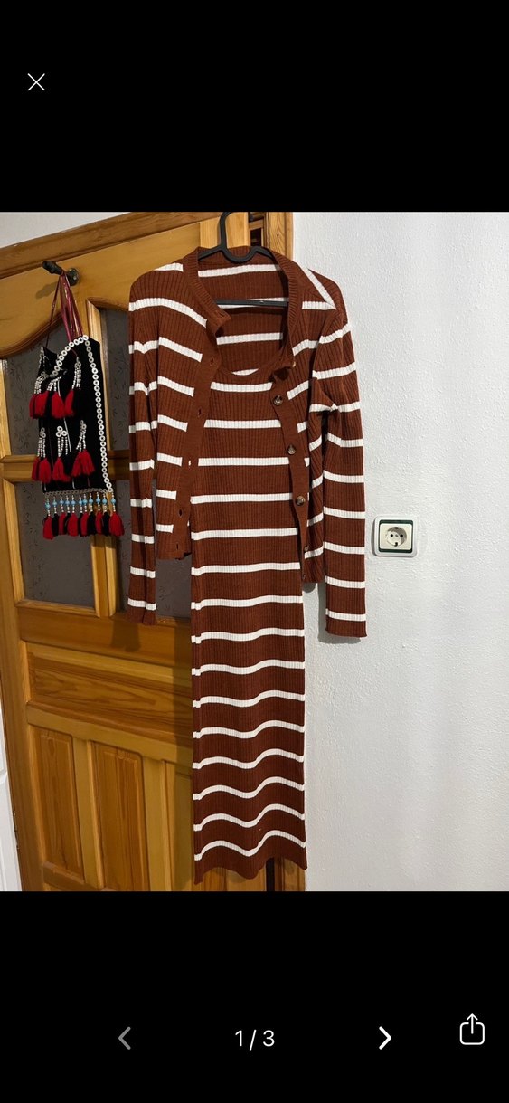 Kahverengi ve beyaz çizgili, uzun kollu, vücuda oturan triko elbise. Bohem tarzda, rahat ve günlük kullanım için uygun.