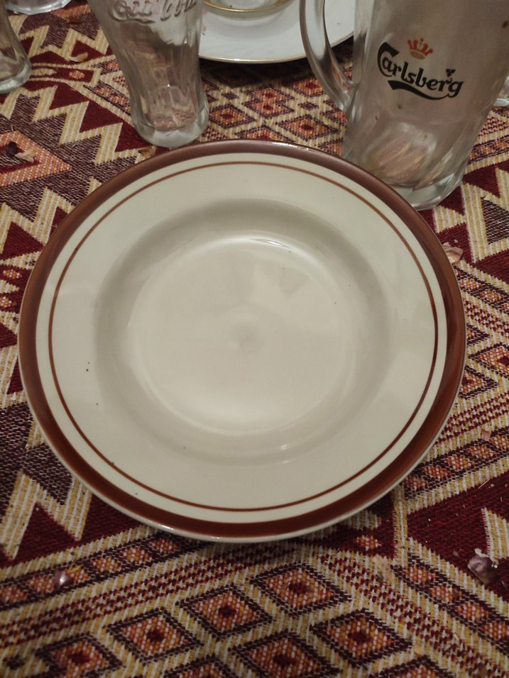Koyu kahverengi çizgili seramik tabak, desenli zeminde yer almakta. Yuvarlak ve parlak yüzeye sahip. ️6 adet gonderilecek