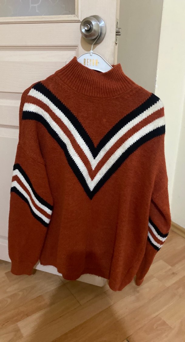 Kahverengi Çizgili Yüksek Yaka Kadın Kazak