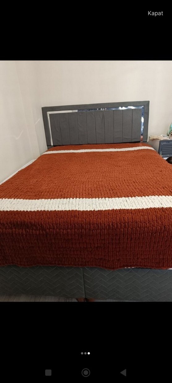 Yumuşak kahverengi yatak örtüsü, sade beyaz çizgi deseniyle. Rahat ve sıcak bir dokunuş sağlar. Alize puffy ipiyle örülmüştür istediğiniz ölçü ve modelde renkde yapıyorum fiyat sorunuz bu fiyat temsilidir