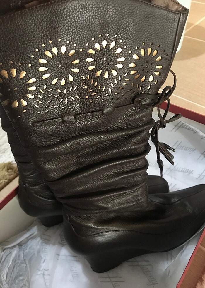 Kahverengi diz altı deri çizme temiz ürün Varak renkte desenli yan iç taraftan fermuarlı esneme yapması İçin hafif lastikli temiz ürün defosu yok