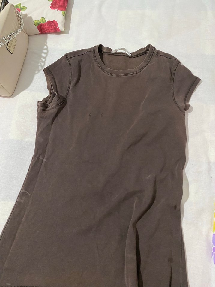 Yumuşak kumaştan yapılmış, kısa kollu ve yuvarlak yakalı kahverengi çocuk atleti. Üst üste giymek için uygun.