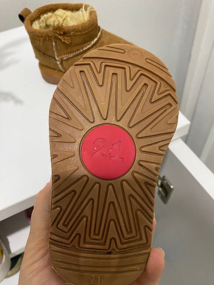Kahverengi, cocuk botları. Kauçuk malzemeden yapılmış, parlak yüzeye ve desensiz tasarıma sahip, rahat ve şık günlük kullanım için uygundur.