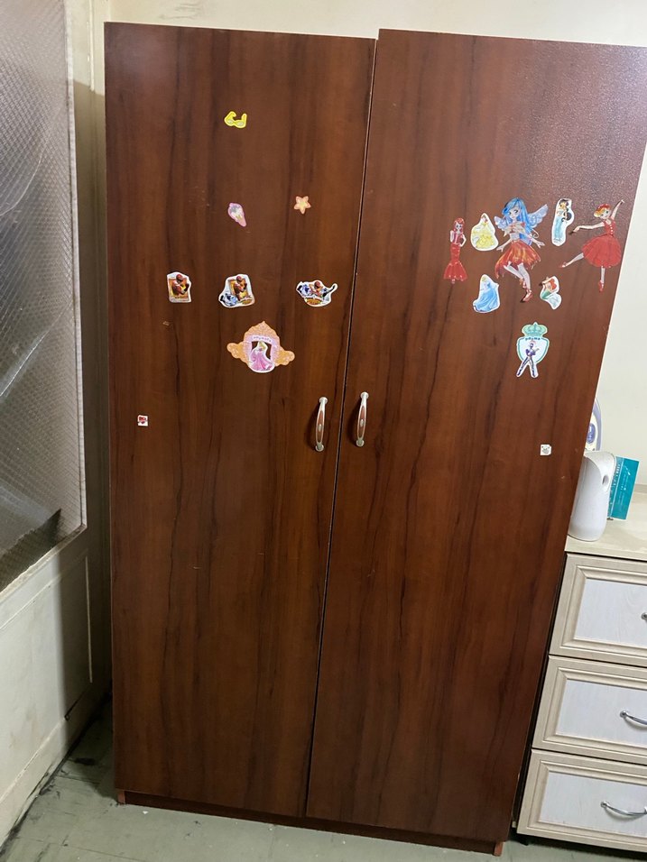 İki kapaklı, koyu kahverengi çocuk gardırop, sade kulplu ve renkli çıkartmalarla süslenmiş. Çıkartmalar temizlenebilir. Sadece bi kapağı biraz üstte duruyor fotoğrafta gözüküyor onun dışında bi kusuru yok.