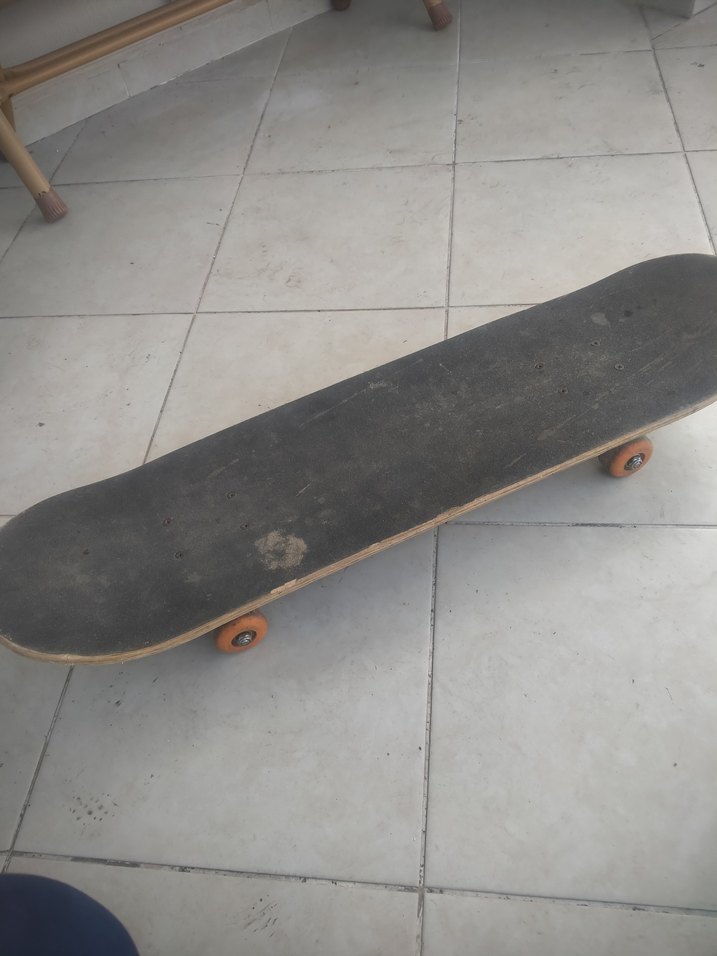 Basit tasarımlı koyu kahverengi çocuk kaykayı, turuncu tekerleklerle başlangıç için uygundur.