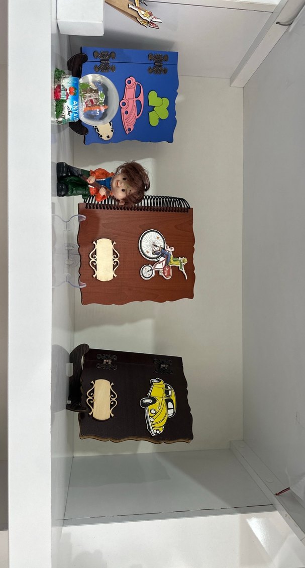 Kahverengi çocuk raf seti, eğlenceli araba ve bisiklet desenleriyle çocuk eşyalarını düzenlemek için uygundur.