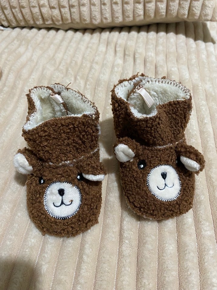 Kahverengi, nakışlı ayı yüzlü, yumuşak kumaştan örme erkek çocuk sıcak ev terliği. Rahat ve konforlu kullanım sunar.