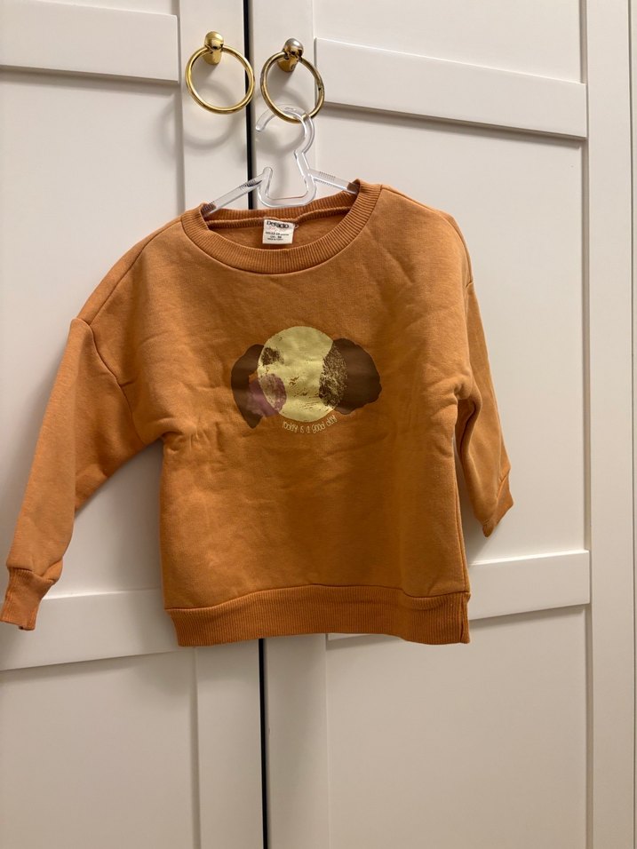 Kahverengi çocuk sweatshirt, yuvarlak yaka ve uzun kollu, bol kesimdir. Baskılı deseni ve kürk detayları bulunur, yumuşak ve sıcak kumaştan üretilmiştir.