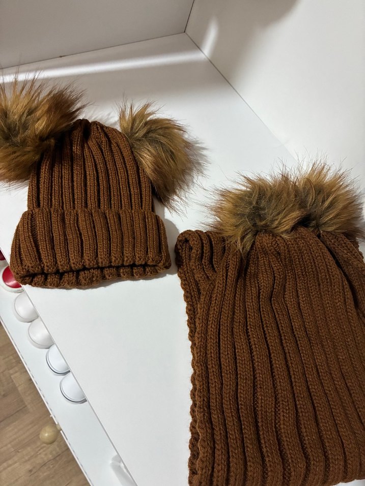 Kahverengi çocuk triko bere ve atkı seti, düz ve desensiz tasarımıyla yumuşak, sıcak dokuma kumaşa sahip, sokak stili için uygun sevimli yapay kürk ponponlarla tamamlanmıştır. hiç kullanılmadı .2 yaşa kadar olur esnek