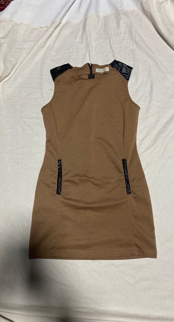 Kahverengi kolsuz midi elbise, yüksek yakalı ve Pürüzsüz sentetik kumaştan, omuz ve cep detaylarında siyah şeritlerle trend casual stil sunar.