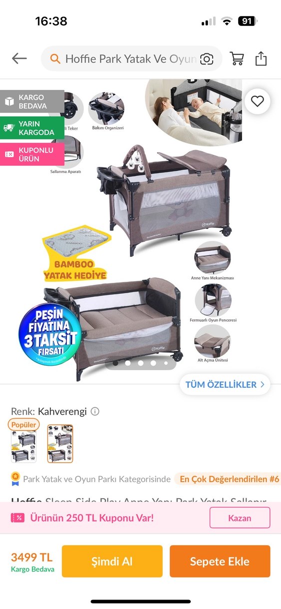 Kahverengi park yatak, bambu yatak, yan organizer ve file pencere içerir. Sallanma aparatı ve yan yatak mekanizması bulunur. Taşıma çantası da mevcuttur. 5 ay garantilidir. Hiç bir kusuru ve hatası yoktur sadece beşikteki bebekleri eksik geri kalan herşeyi sıfırdır.