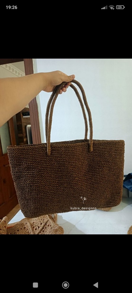 Koyu kahverengi örgü kadın çanta, minimalist ve bohem tarzda, günlük kullanıma uygun. Desensiz tasarımıyla zahmetsiz şıklık sunar.