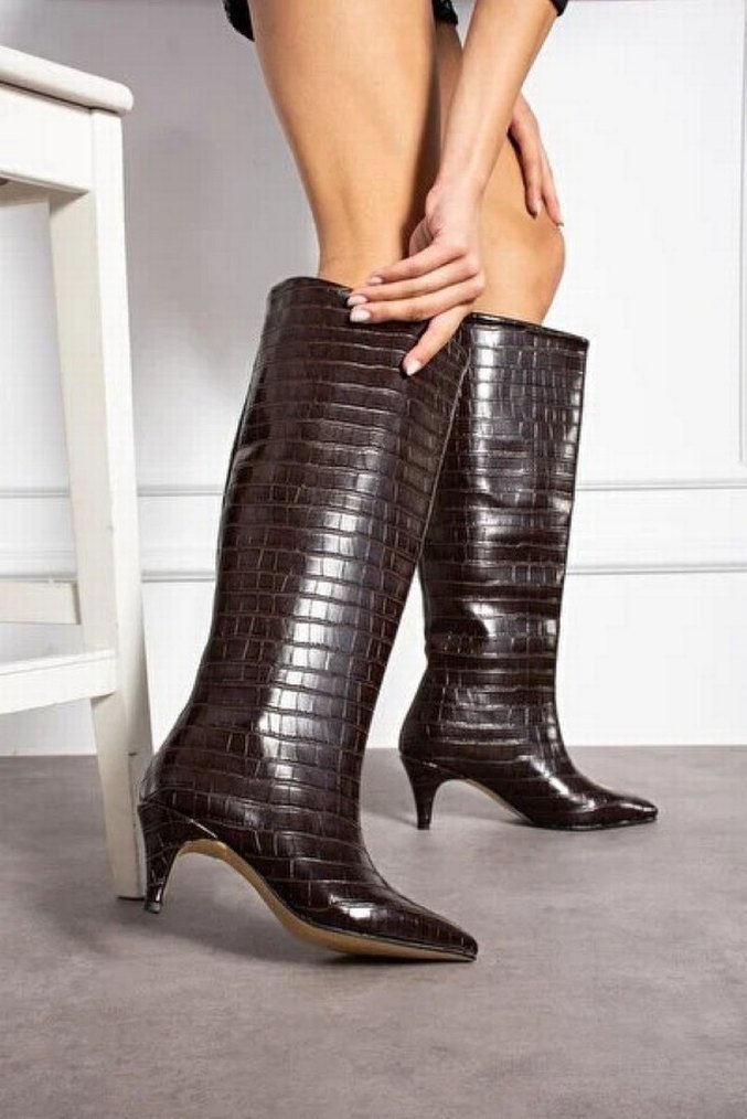 Kahverengi croco desenli, tokalı, deri dizüstü kadın çizmesi, sivri topuklu ve çağdaş tarzda, cesur bir görünüm sunar.