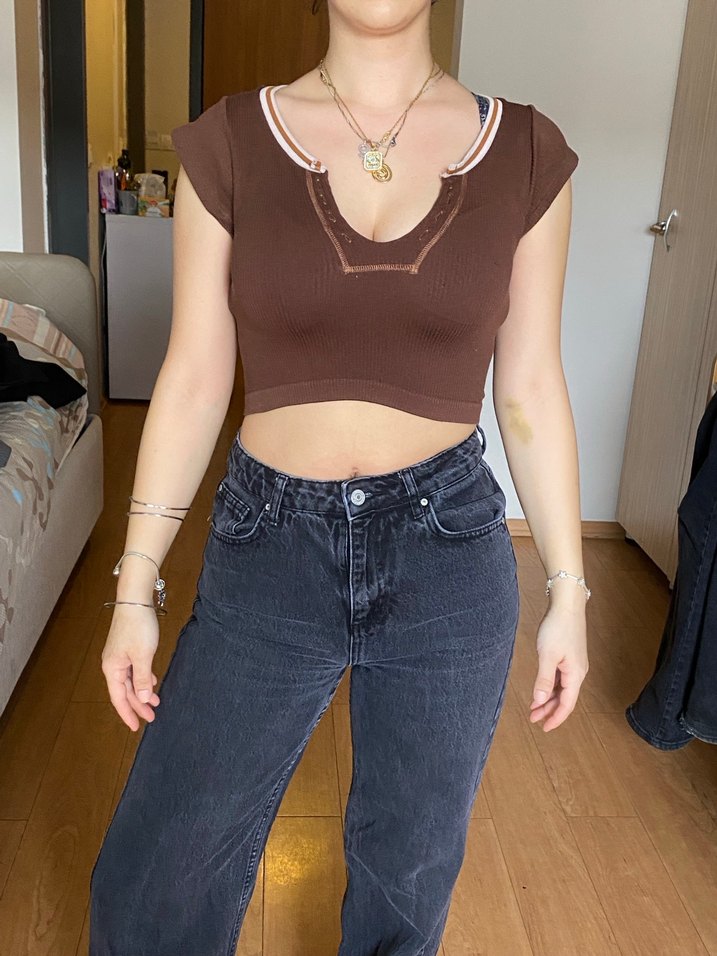 Kahverengi, dar crop. Günlük kullanım ve sokak stiline uygun, zahmetsiz şıklık sunar.