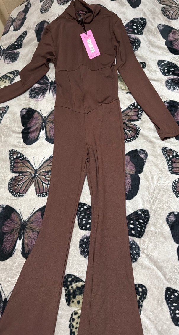 Kahverengi, uzun kollu, yüksek yakalı, dekoltesi ayarlanabilir ince fermuar detaylı ve korse detaylı bu tulum, dalgıç kumaştan yapılmış ve günlük kullanım için şık bir sokak stili sunar.