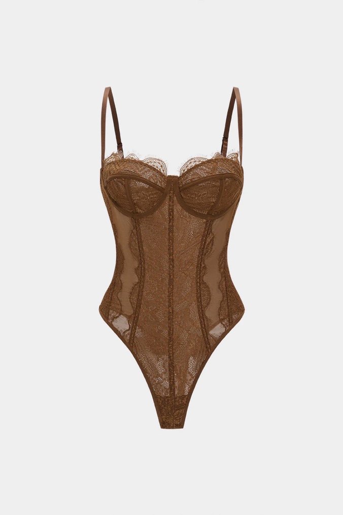 İnce ayarlanabilir askılı, kahverengi dantel bohem tarzda, Paris esintili yapılandırılmış büstiyer.