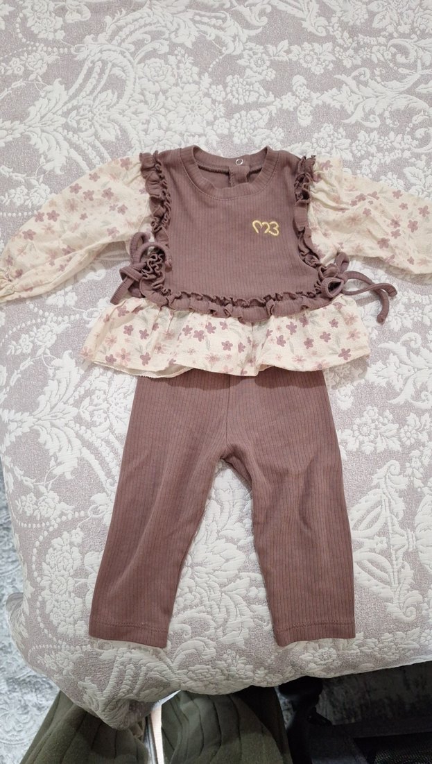 Uzun kollu, kahverengi pastel tonlarda, nakışlı dantel detaylı bebek kız takımıdır.
