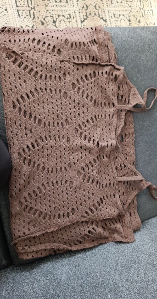 Kahve renkli, örgü dokulu ve dantel detaylı kadın pareo, bohem ve rahat bir tarz sunar.
