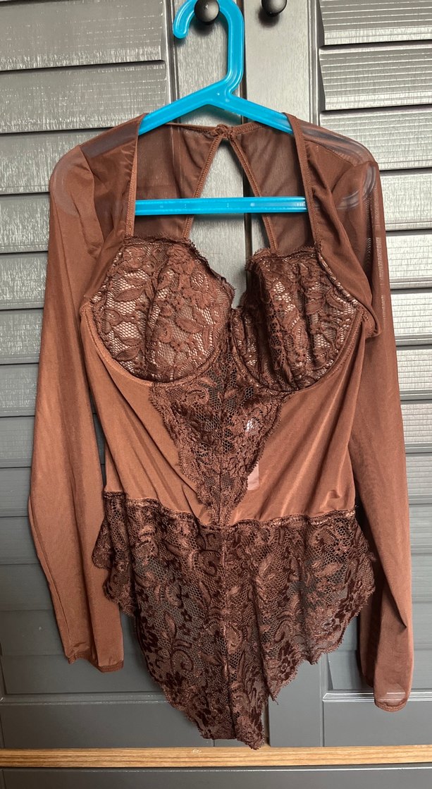 Koyu kahverengi, dantel detaylı, uzun kollu ve normal midi boyda, vücuda oturan hemşire korsesi.