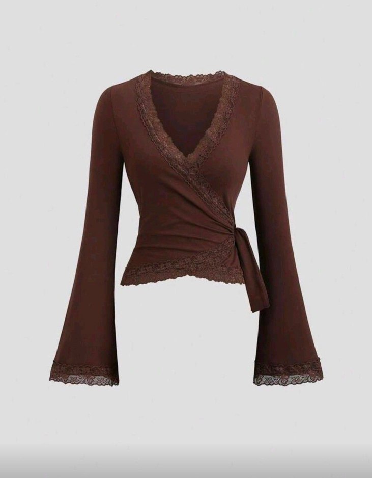 Kahverengi Dantel Detaylı Uzun Kollu Bluz
