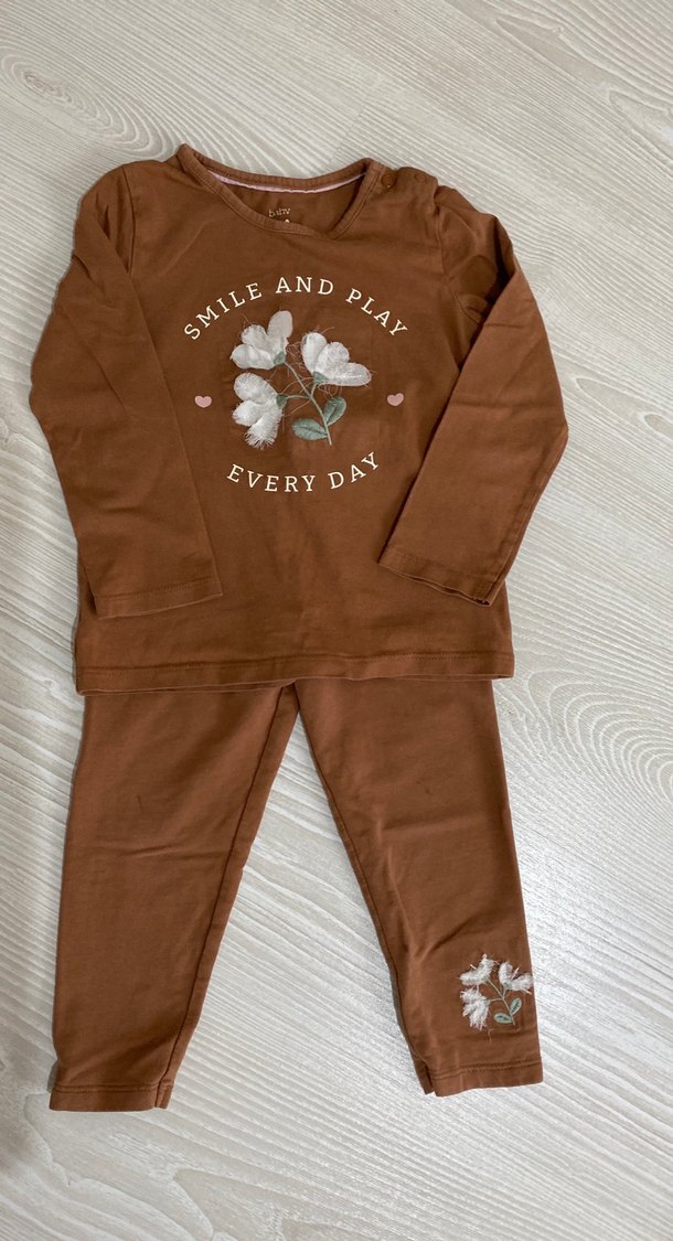 Kahverengi uzun kollu bebek kız takımı, dantelli çiçek desenleriyle şık ve rahat bir seçenek sunar.