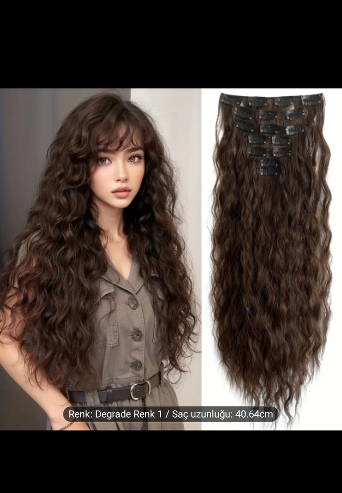 Sentetik kumaştan yapılmış, kürklü detaylı kahverengi dalgalı saç eklenesi. Uzunluğu yaklaşık 40,64 cm, koyu degrade renklidir.