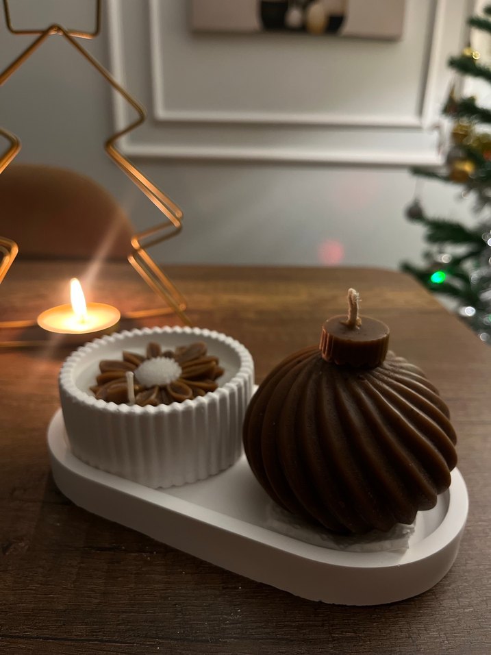 Koyu kahverengi, yuvarlak ve kabartmalı bir mum ile çiçek desenli beyaz bir mumluk, oval tepsi üzerinde yer alıyor. ️