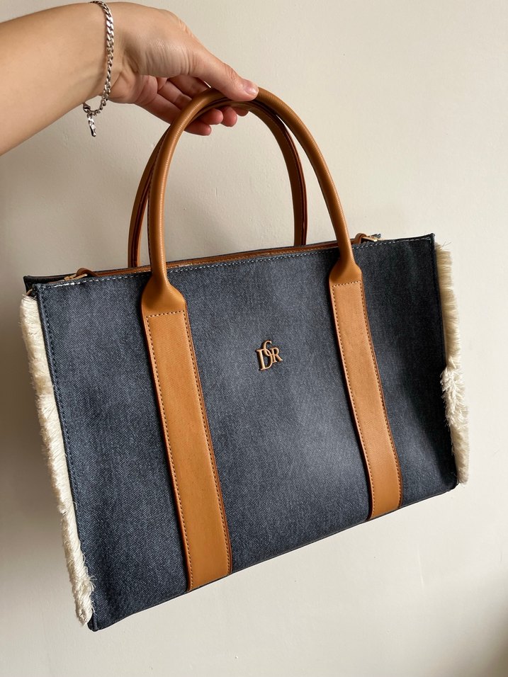 Kahverengi saplı, gri baskılı denim gövdeli kadın çanta. Yanlarda kürklü detaylarıyla bohem tarzı ve trend günlük görünümü birleştirir. Günlük kullanıma uygundur.